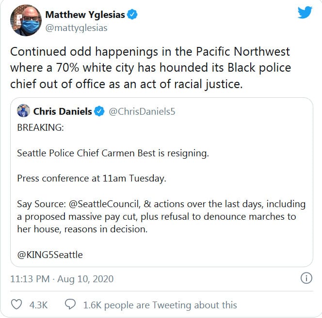 And of course: ‘Warmongering egg’ Matt Yglesias dragged by blue-check libs for 100% accurate take on the Seattle police chief.