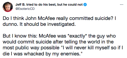 And yes, #JohnMcAfeeDidntKillHimself is a real hashtag at the moment.
