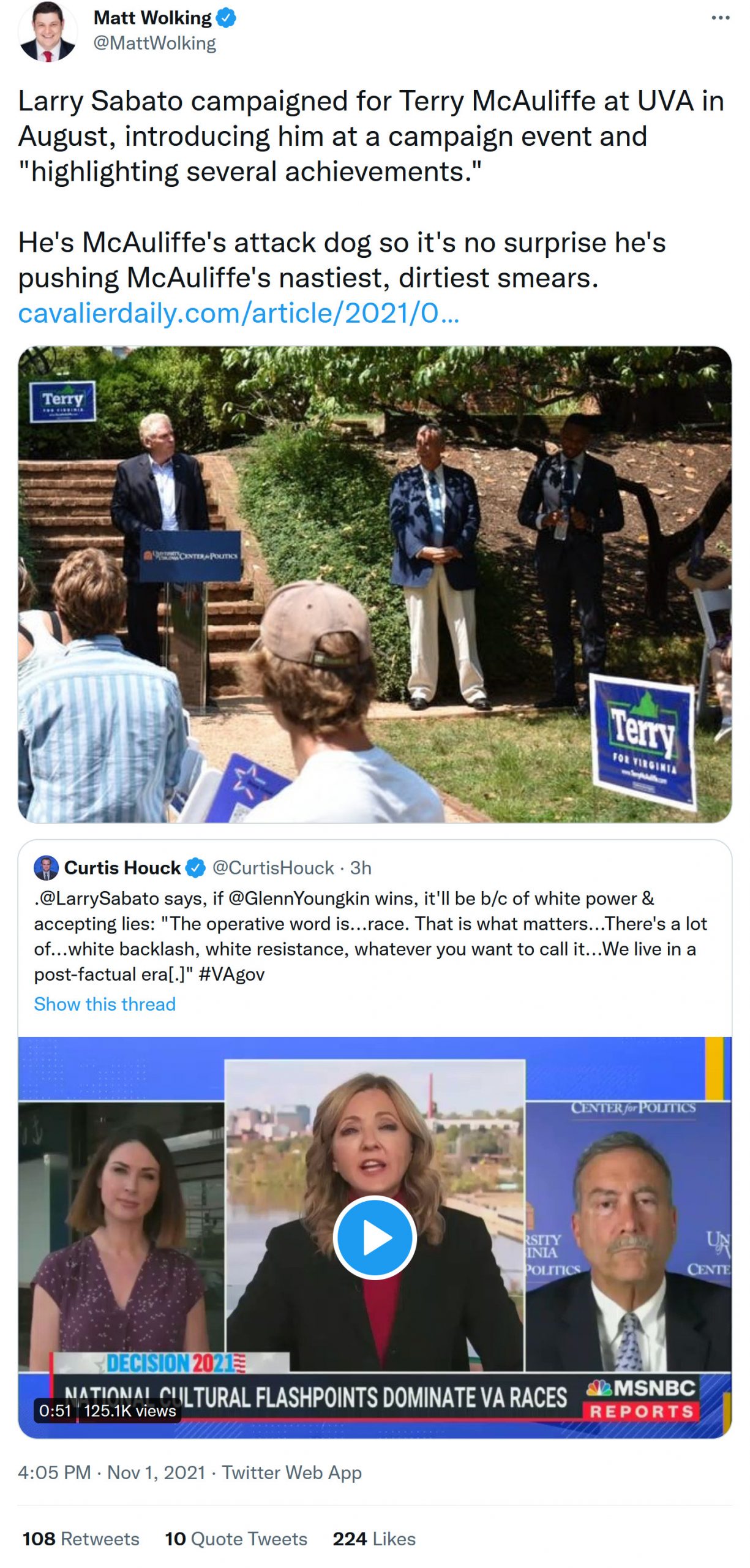 “Sabato says, if [Youngkin] wins, it’ll be b/c of white power & accepting lies: ‘The operative word is…race. That is what matters…There’s a lot of…white backlash, white resistance, whatever you want to call it…We live in a post-factual era.”
