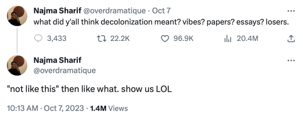 She reposted on X: “Liberation, self-determination, and peace for all oppressed + colonized people. That’s my politics.”