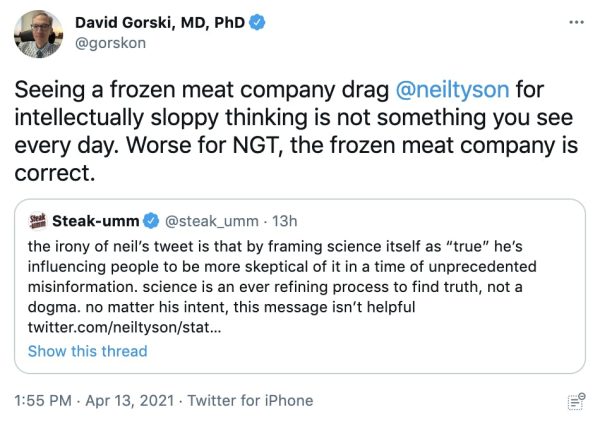 the irony of neil’s tweet is that by framing science itself as “true” he’s influencing people to be more skeptical of it in a time of unprecedented misinformation. science is an ever refining process to find truth, not a dogma. no matter his intent, this message isn’t helpful https://t.co/sf4zLm33Jm
