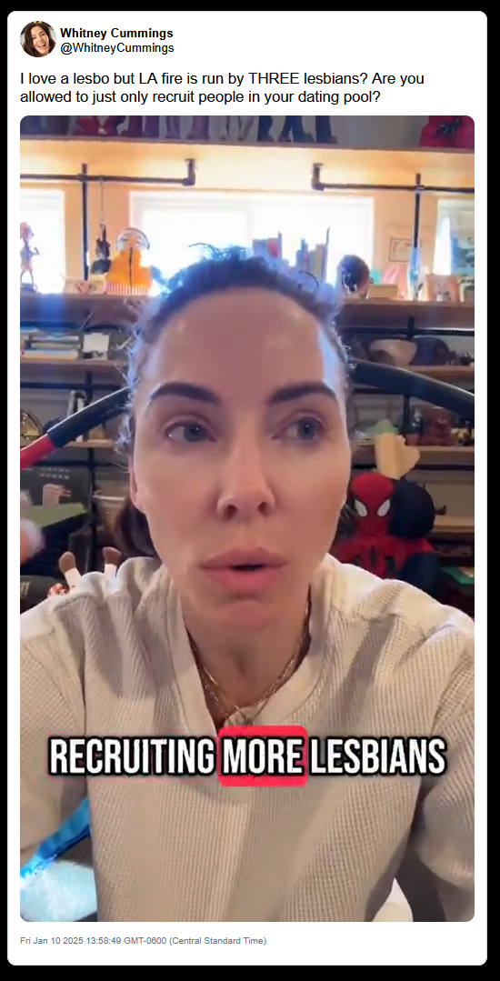 Exit questions from center-left comedienne Whitney Cummings: [Tweet since deleted; but archived with video at the Wayback Machine.]