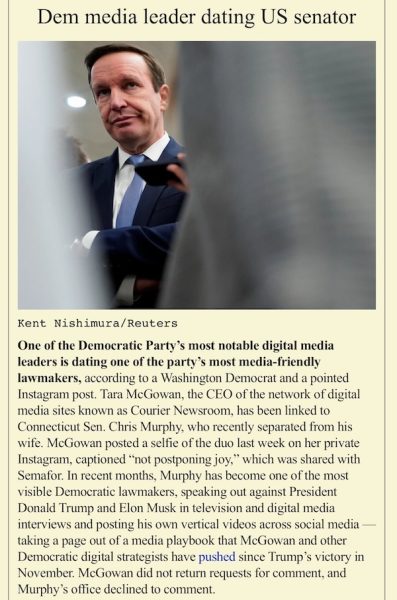 “BREAKING: Per Semafor, Democrat Senator Chris Murphy is dating left wing dark money FAKE NEWS media network CEO Tara McGowan.’