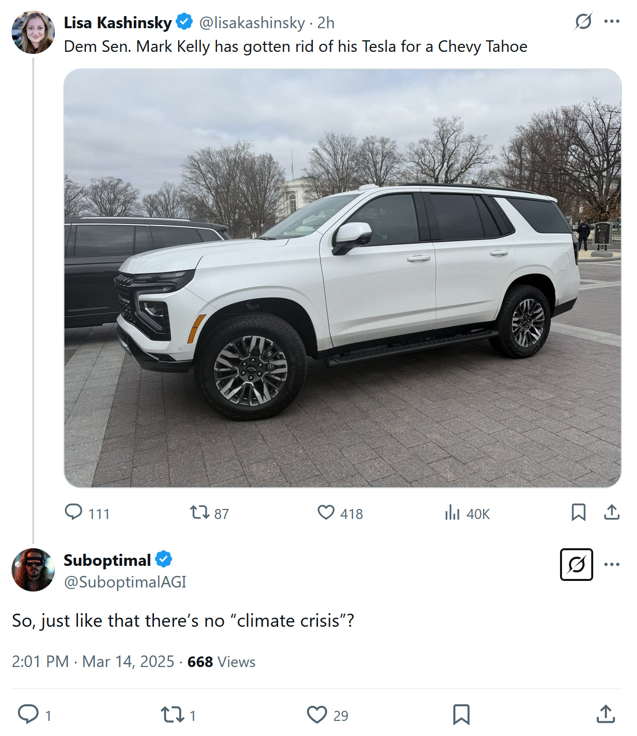 Mark Kelly’s Musk Derangement Syndrome is causing him a definite “past performance is no guarantee of future results” moment: ‘Trashing the Climate to Own the Cons’! Here’s What Dem Sen. Mark Kelly Traded in His Tesla For.