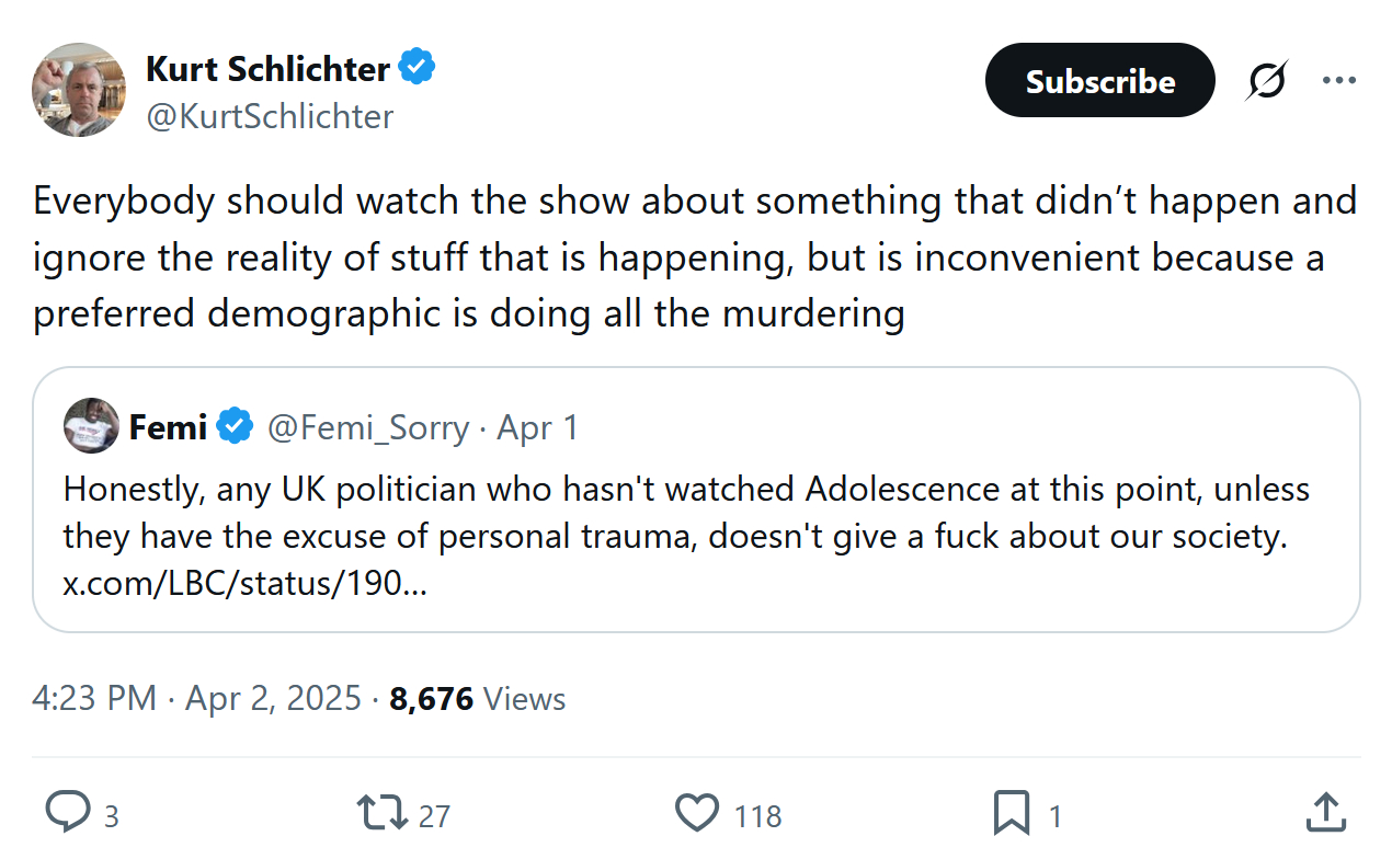 Kier Starmer’s obsession with Adolescence allows him to ignore broader issues happening in England, but, to use a quaint old term, aren’t very politically correct: