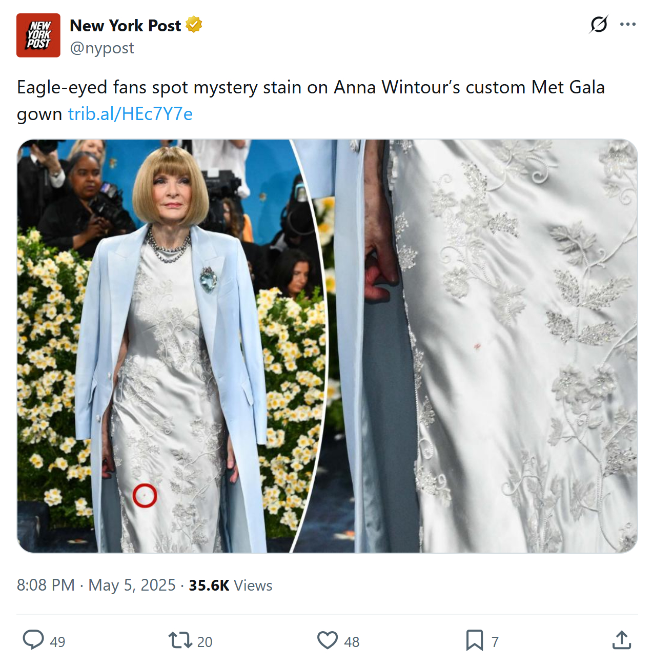 UPDATE: Beautiful Clothes Hide Ugly Souls at the Met Gala: “Last night, in a bit of karmic revenge, a stain appeared on Anna Wintour’s dress. The dress, like Dorian Gray’s portrait, surely said something about the soul to whom it belonged. Tina Fey, who attended many years ago, summed up the event best by describing the Met Gala as a ‘jerk parade.’ Anna Wintour is the grand marshal.”