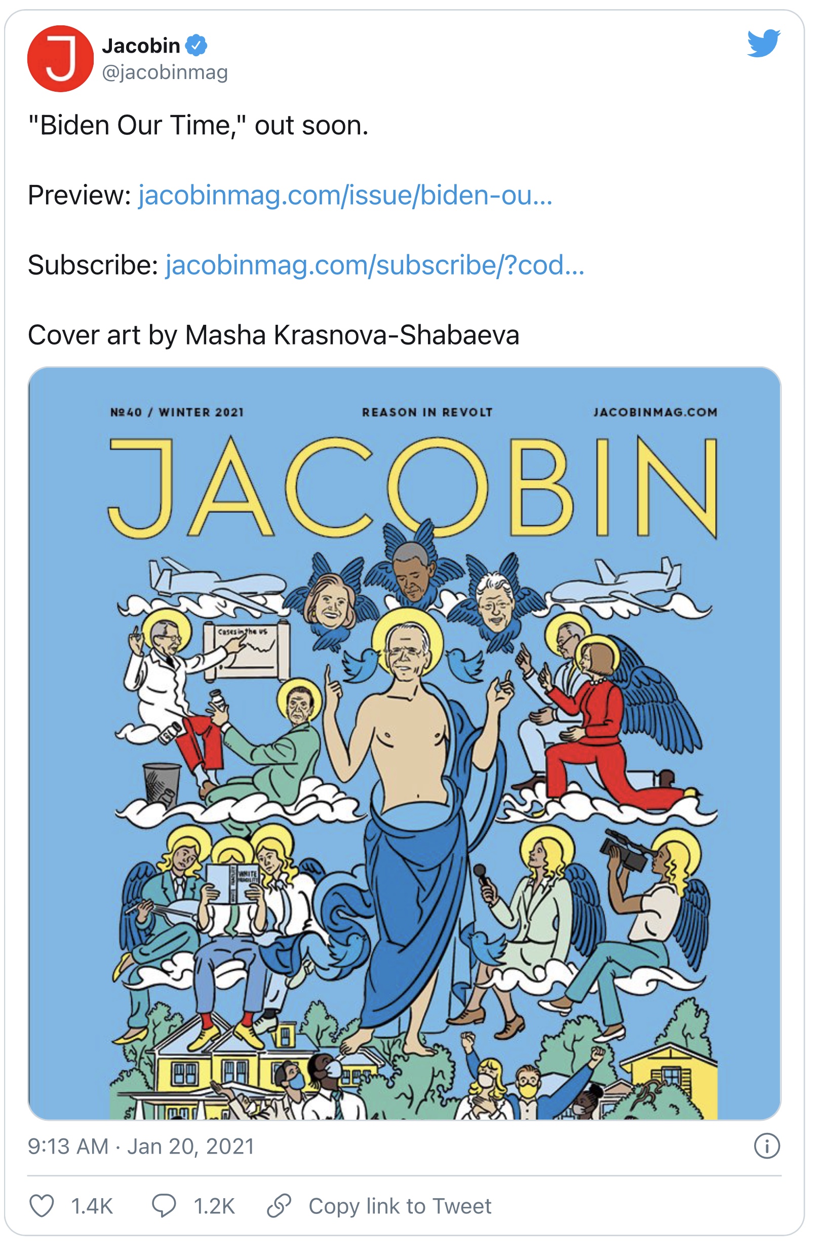 In 2009, Newsweek’s Evan Thomas declared that Obama was “Sort of God,” and in 2021, anticipating who would be running the country again, far left Jacobin magazine published a similarly-themed cover: