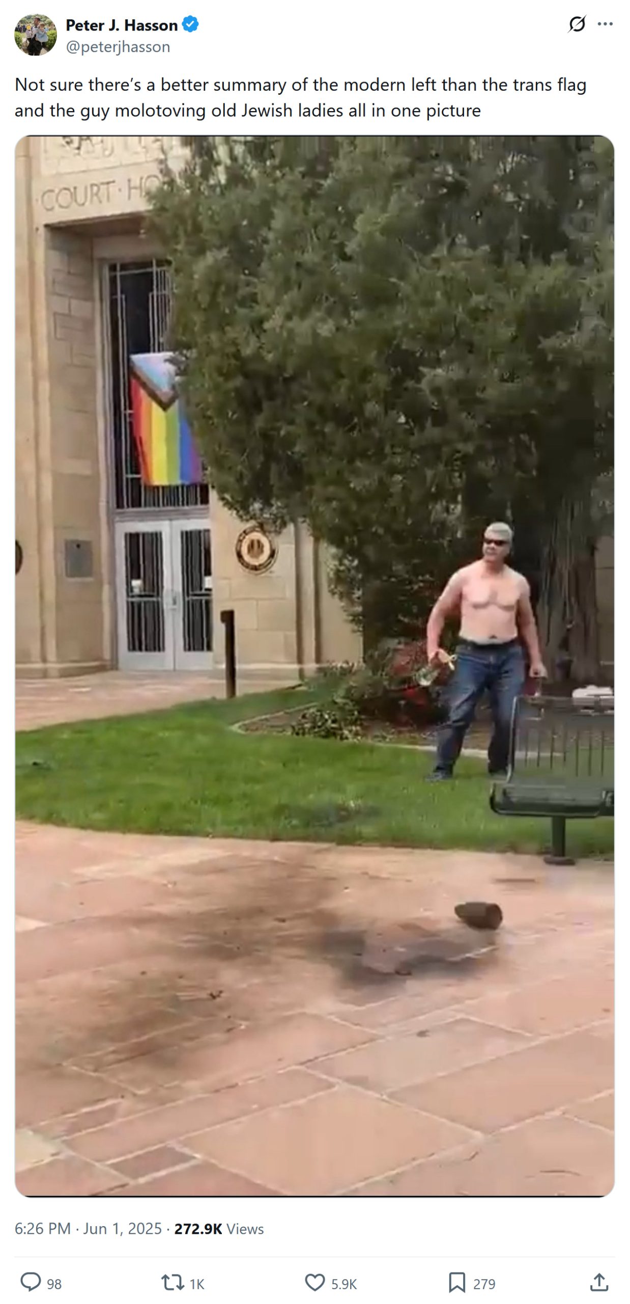 One of the core tenets of Hamas and every other virulently antisemitic terrorist group is that there is no such thing as an innocent civilian, that every Jew everywhere in the world is a legitimate target. We’re seeing that same worldview at work on our own soil. These people don’t hate Israel; they just hate Jews and don’t want to admit it.