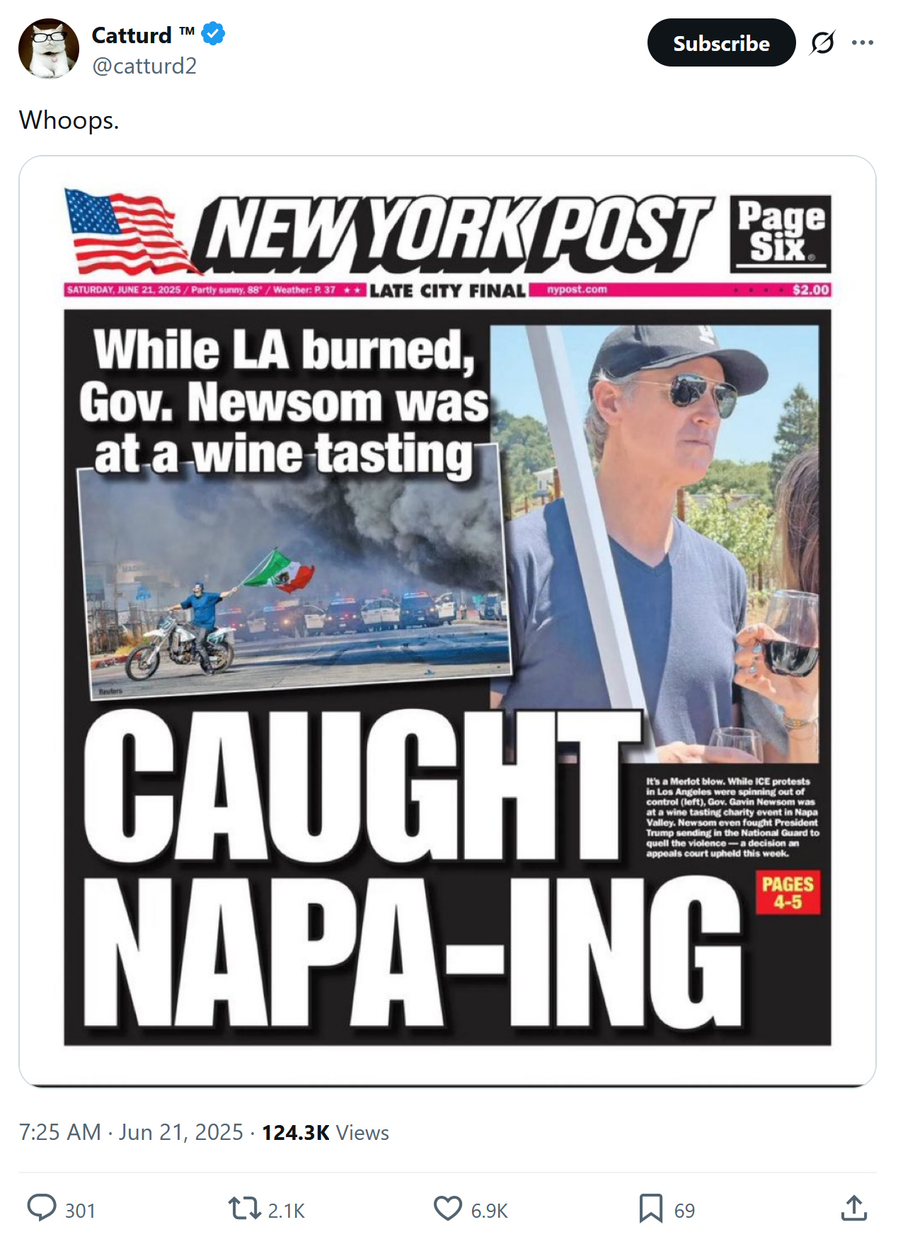 As riots engulfed Los Angeles and mobs vandalized public buildings, incinerated vehicles, and assaulted law enforcement officers, California governor Gavin Newsom was enjoying a swanky wine-tasting party in Napa Valley.