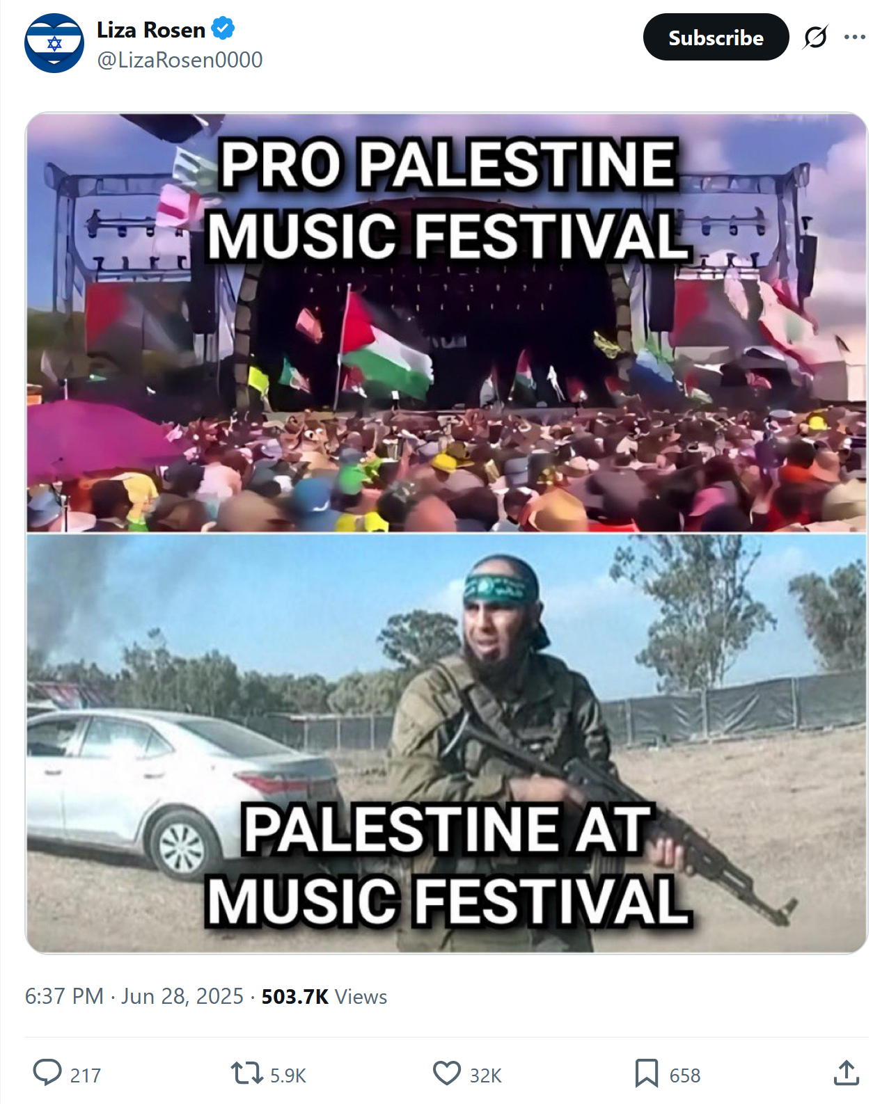 Let’s not muck about here. When punk-rap duo Bob Vylan called for the killing of Israeli soldiers yesterday – as they warmed up the crowd at the West Holts Stage for every Israelophobe’s new favourite Irish rap trio, Kneecap – they weren’t opposing war. They were calling for war, and on the one army on Earth charged with protecting Jews from genocide. The army now at war with a jihadist cult that murdered, raped and kidnapped its way through an Israeli festival not unlike Glastonbury on 7 October 2023. The army that almost all Israelis are expected to serve in. Indeed, those making excuses for that sickening call-and-response yesterday hopefully don’t know that Hamas justifies killing Israeli civilians on the grounds that they are basically all tainted by national service. That they are all enemy combatants. Death, death to that IDF?