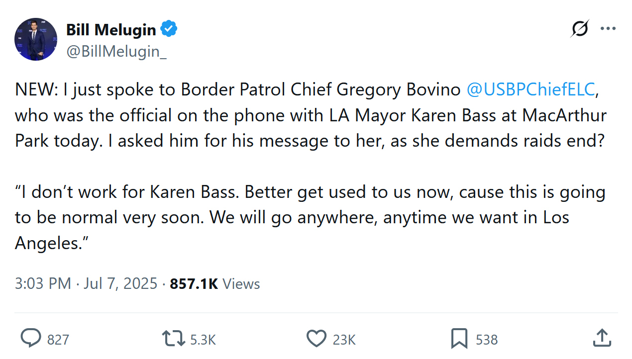 Bass, who was due to meet with California Gov. Gavin Newsom in the morning, showed up in the middle of the operation to yell at the agents to get out of the park, slamming the demonstration as a “political stunt.”