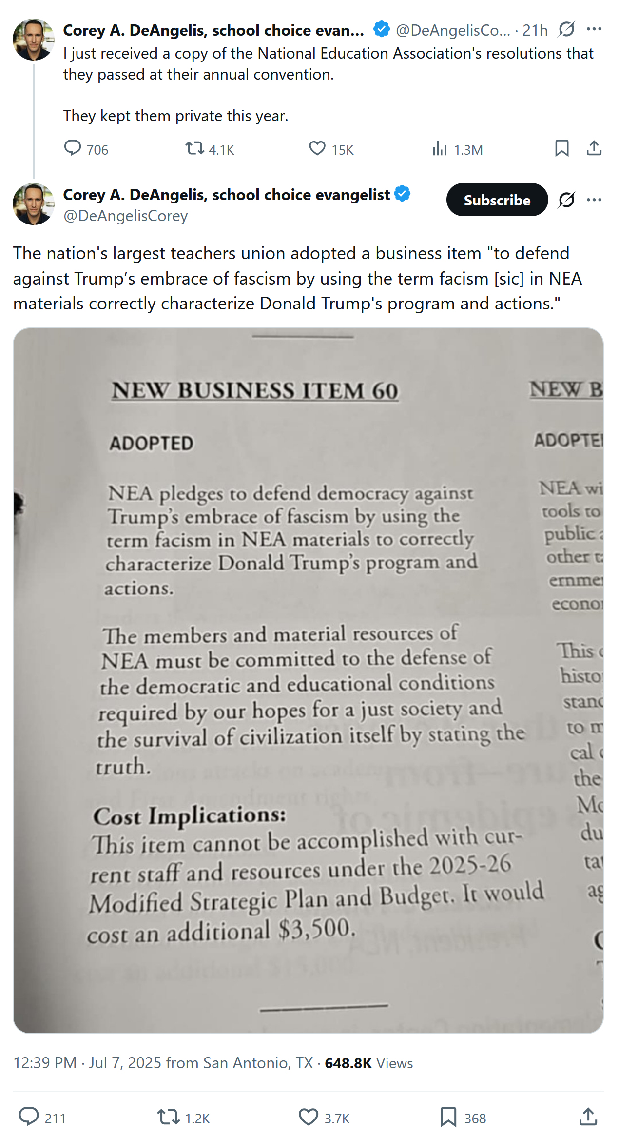 Corey DeAngelis shared several of the resolutions that were adopted by the NEA, saying in a Monday X post, “I just received a copy of the National Education Association’s resolutions that they passed at their annual convention. They kept them private this year.”