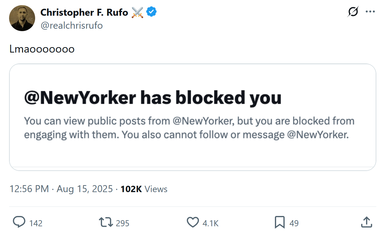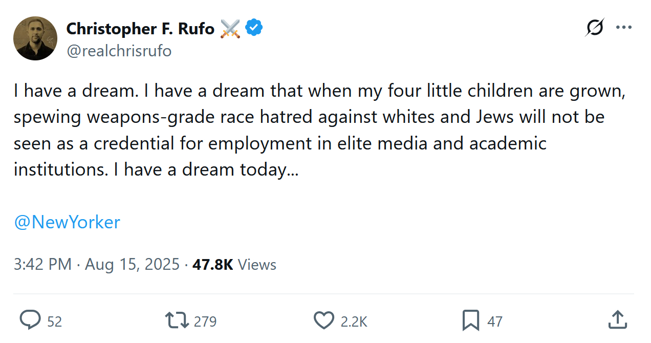 Once Rufo began retweeting her, St. Felix of course deleted her X account, but not before many of her tweets were screencapped. Her next article, in which she claims she was the innocent victim of a witch hunt, will be an amazing read.