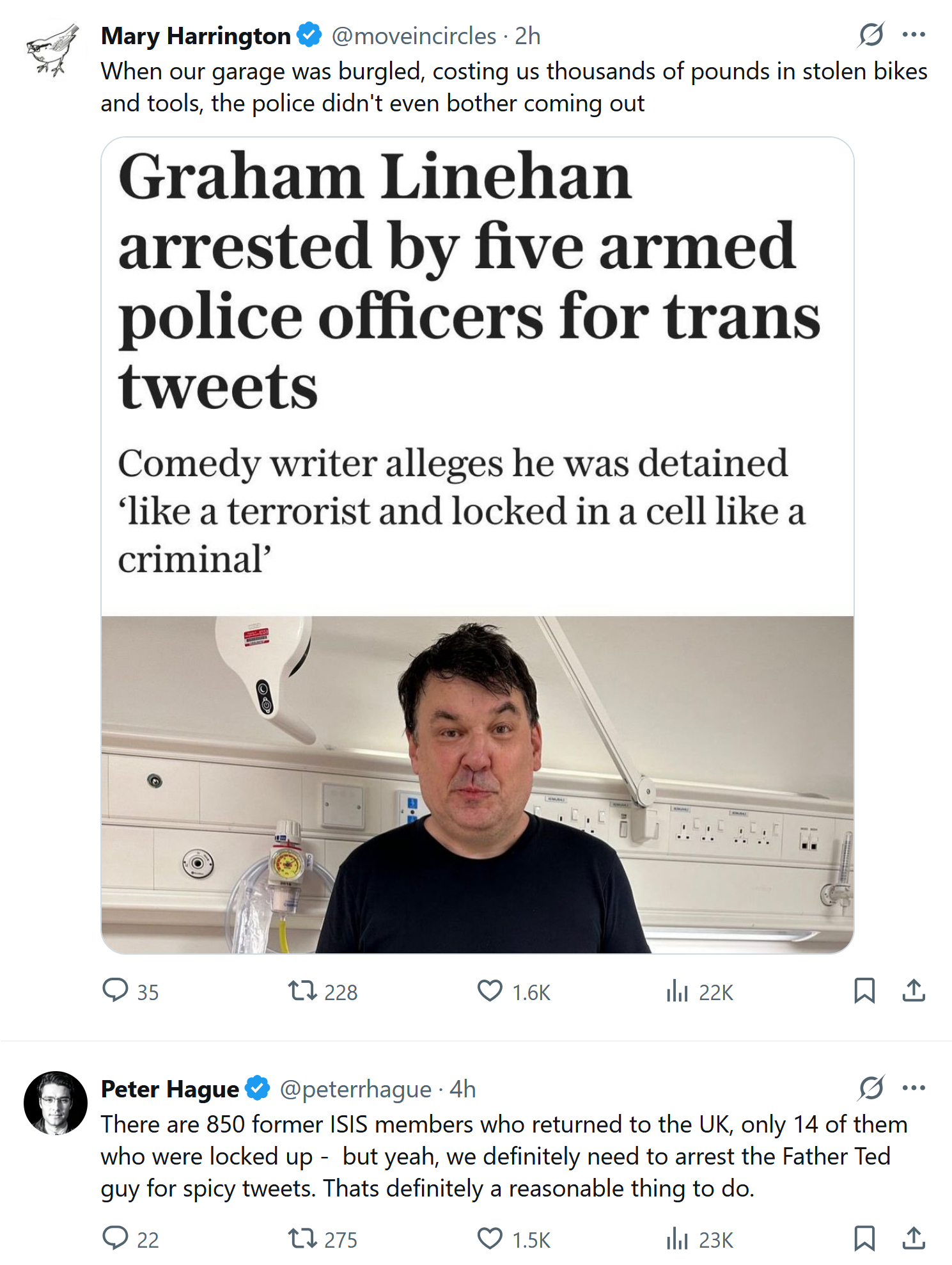 Linehan’s belief that men aren’t women is based on biological truth. It is the view of the overwhelming majority of British citizens. It has been upheld by the UK Supreme Court. It is also a protected belief in the workplace under the Equality Act. Yet none of this seems to matter to the UK’s thoughtpolice. According to Linehan’s account, a trans activist claimed offence and so the Met swooped in, acting as the personal goon squad of the mad, bad and sad.