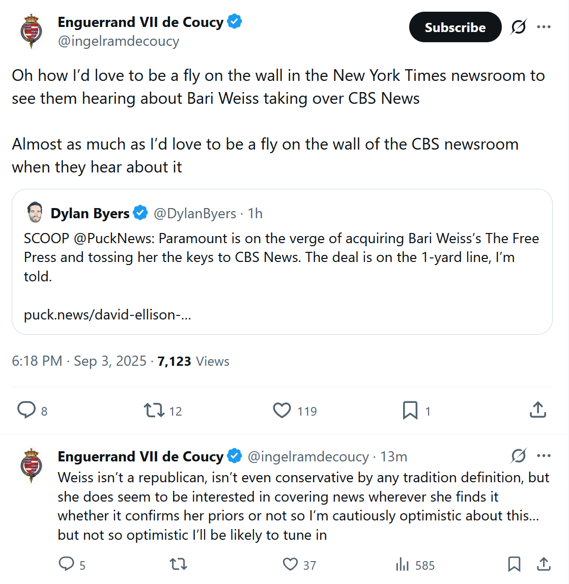 As part of the deal, I am told David plans to give Bari a role at CBS News that would, among other things, task his fellow Millennial with guiding the editorial direction of the division. Bari’s avowedly pro-Israel and anti-woke worldview—not to mention her broadly shit-kicking anti-establishment disposition—would inevitably inspire blowback from various corners of the newsroom, and could dramatically change the editorial posture and reputation of one of the most storied, and certainly self-important, institutions in American journalism. For David, that’s likely part of the point.