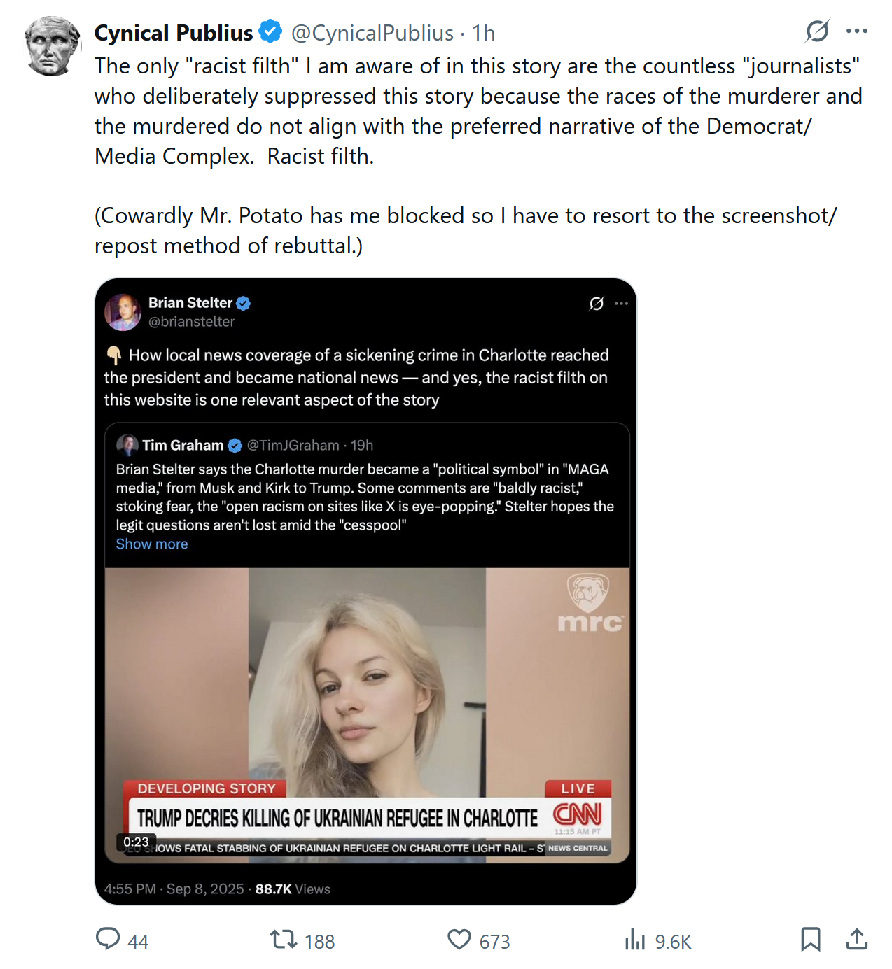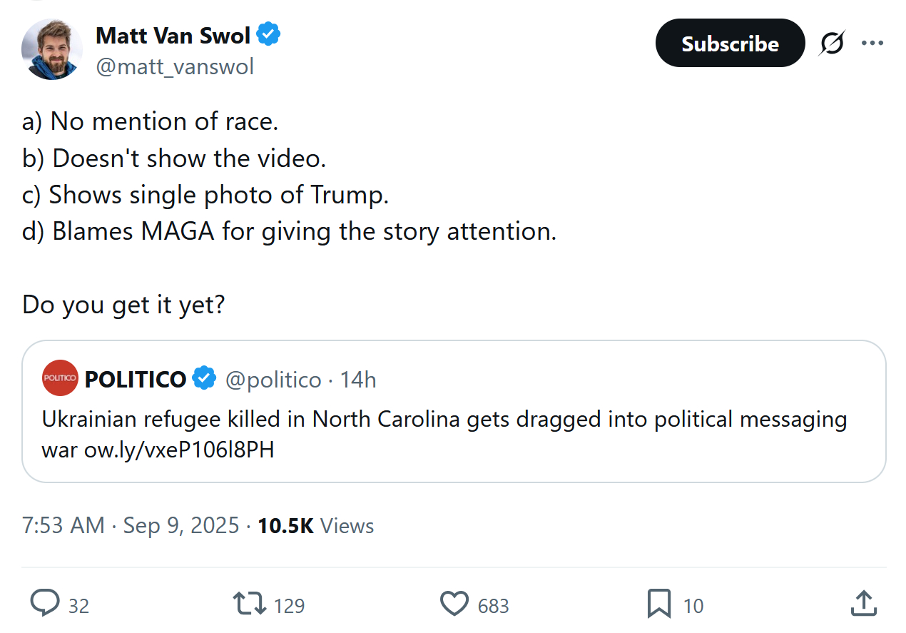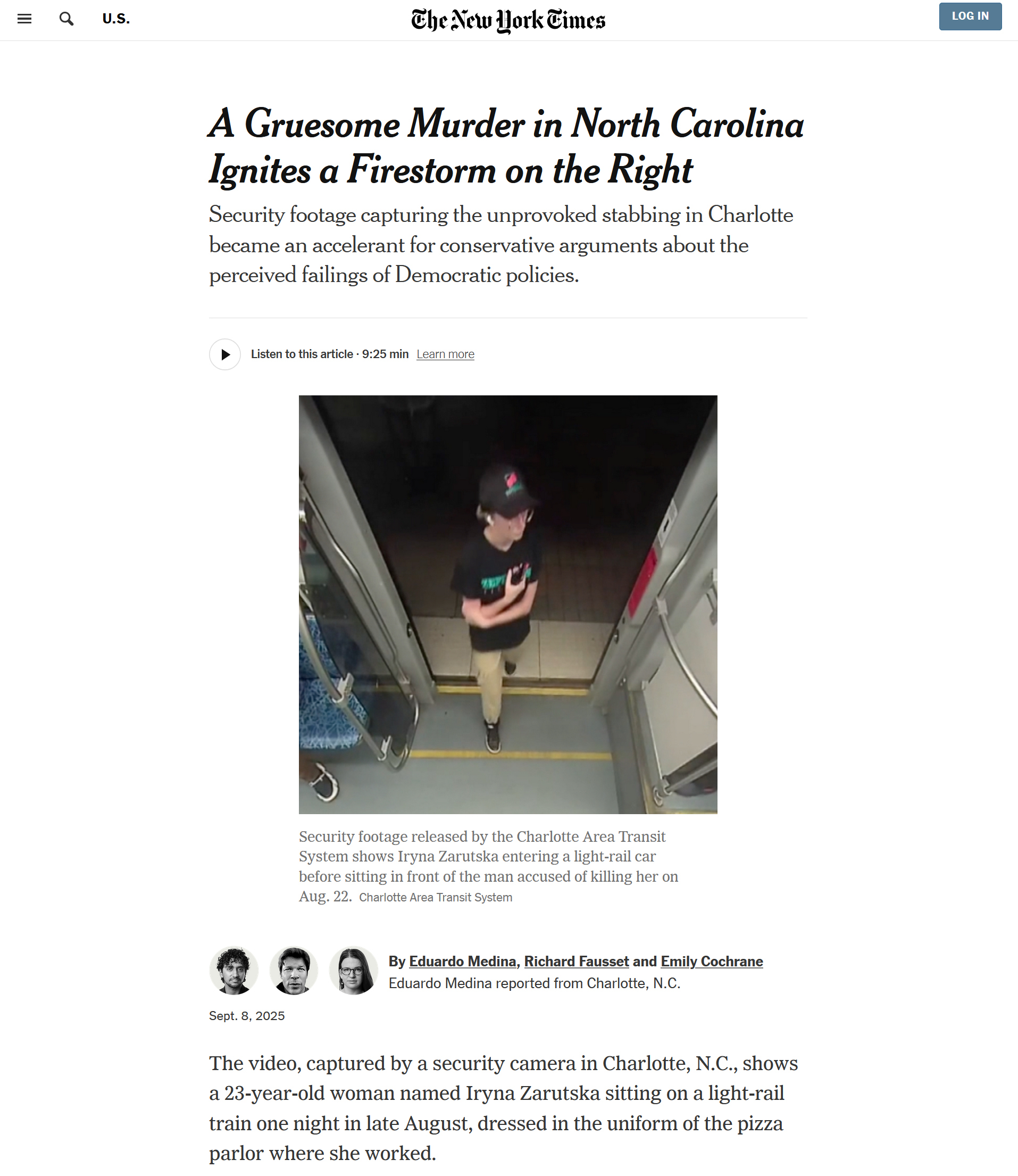 The New York Times finally deigned to cover the Zarutska stabbing today. Naturally, they go with the “Republicans Pounce” angle that the DNC-MSM have all triangulated on, if they’re going to report on this story at all: A Gruesome Murder in North Carolina Ignites a Firestorm on the Right.