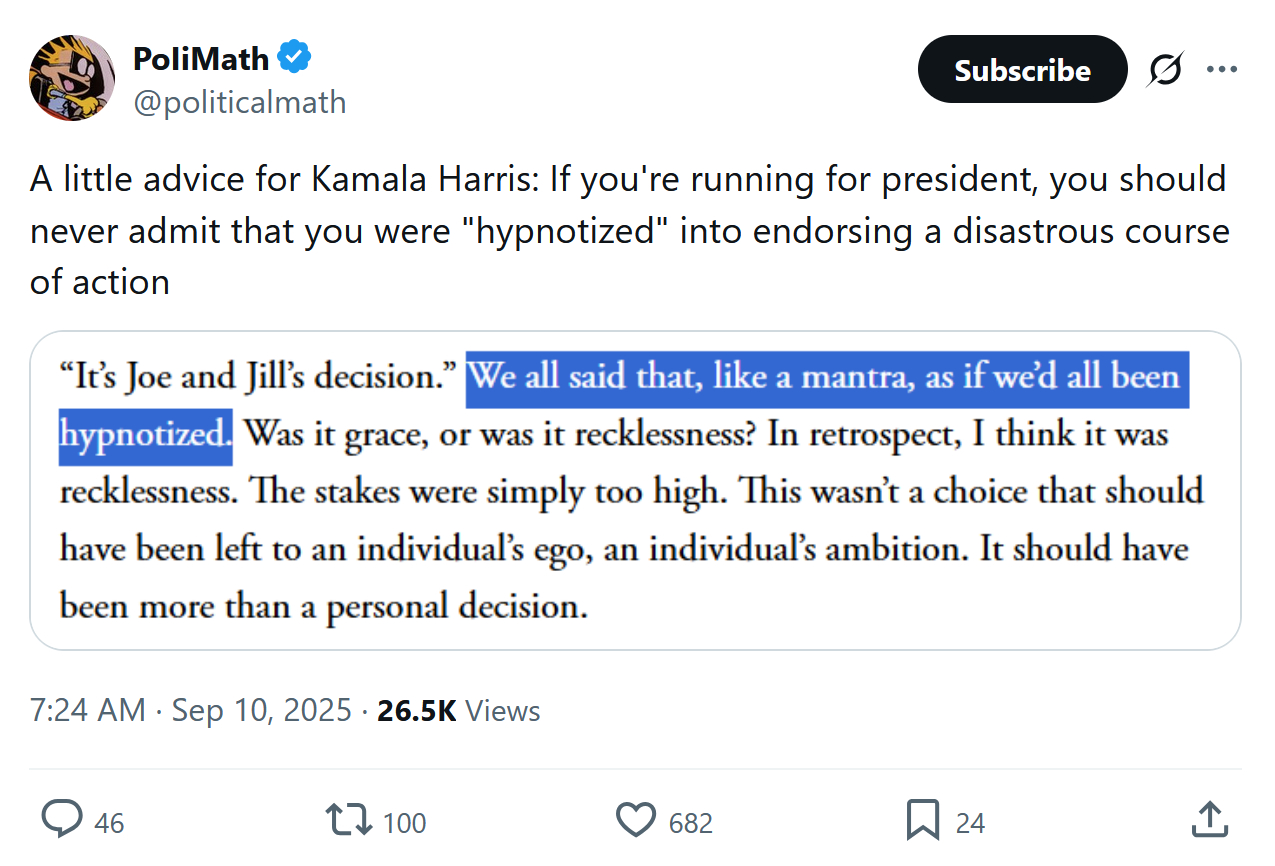 So … what was the “months of growing panic” about, then? Why gripe now about having to remain silent out of loyalty? Harris wants to eat her cake and have it at the same time with this argument. It seems likely now that some in the White House will admit to Biden’s incapacity while in office and implicate Harris as being aware of it. In her book, Harris appears to be providing cover stories to cover all bases, even when those stories contradict each other.