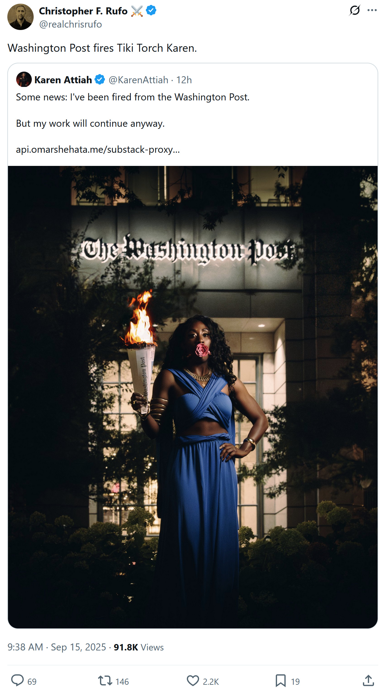 Oliver Darcy has obtained the termination letter sent to Karen Attiah by the Washington Posts’s HR chief.