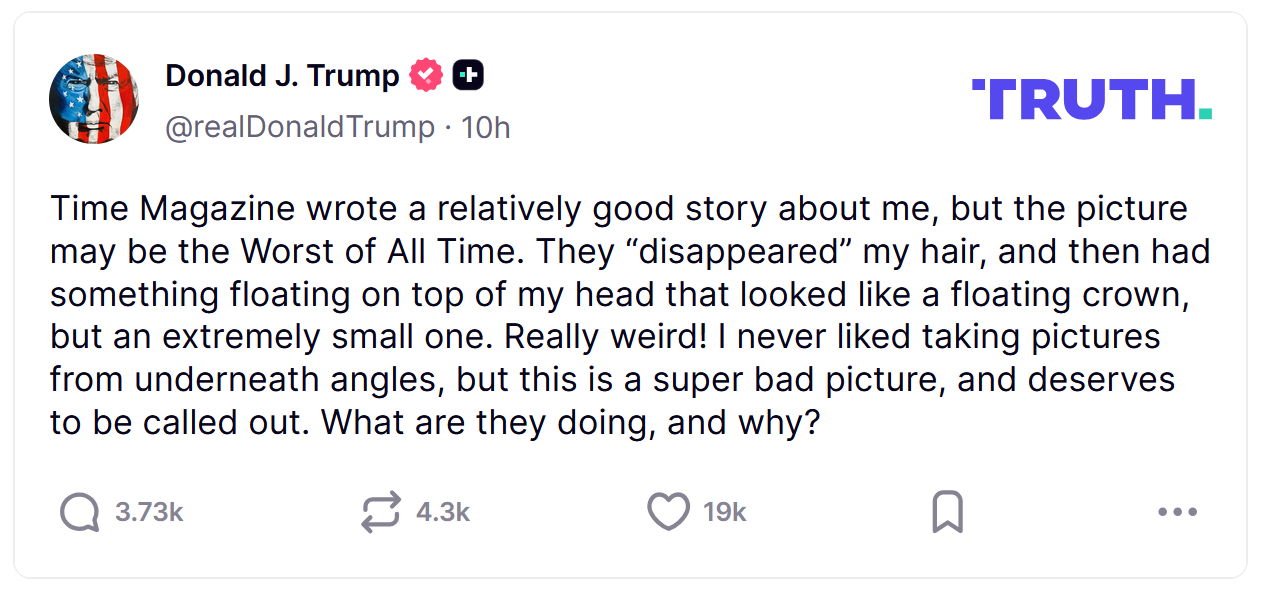 Ed adds, “Back to Time Magazine, however, which featured a weird image of Trump on its cover. Trump complained about it on Truth Social:”