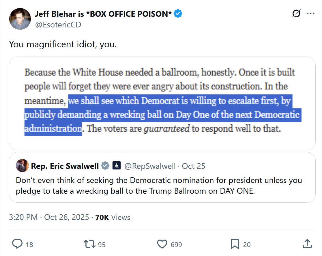 The New Hotness? Destroying the White House! Swalwell’s Wrecking Ball Waltz: Dems’ 2028 Plan to Smash Trump’s Ballroom Out of Pure Spite.