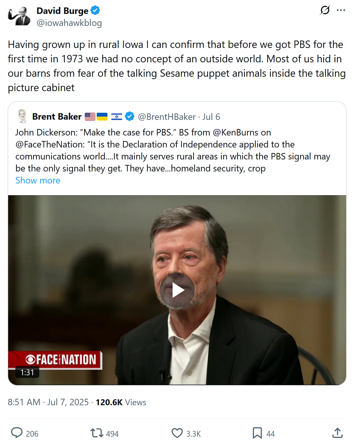Burns and Dickerson are both reasonably intelligent guys. So why does their ideology require that they pretend that it’s still the 1970s, and not an era of innumerable Websites, news outlets and social media platforms, not to mention near-ubiquitous satellite dishes, cable TV, and satellite radio. Why is Ken Burns pretending that PBS “mainly serves rural areas in which the PBS signal may be the only [one] they get?”
