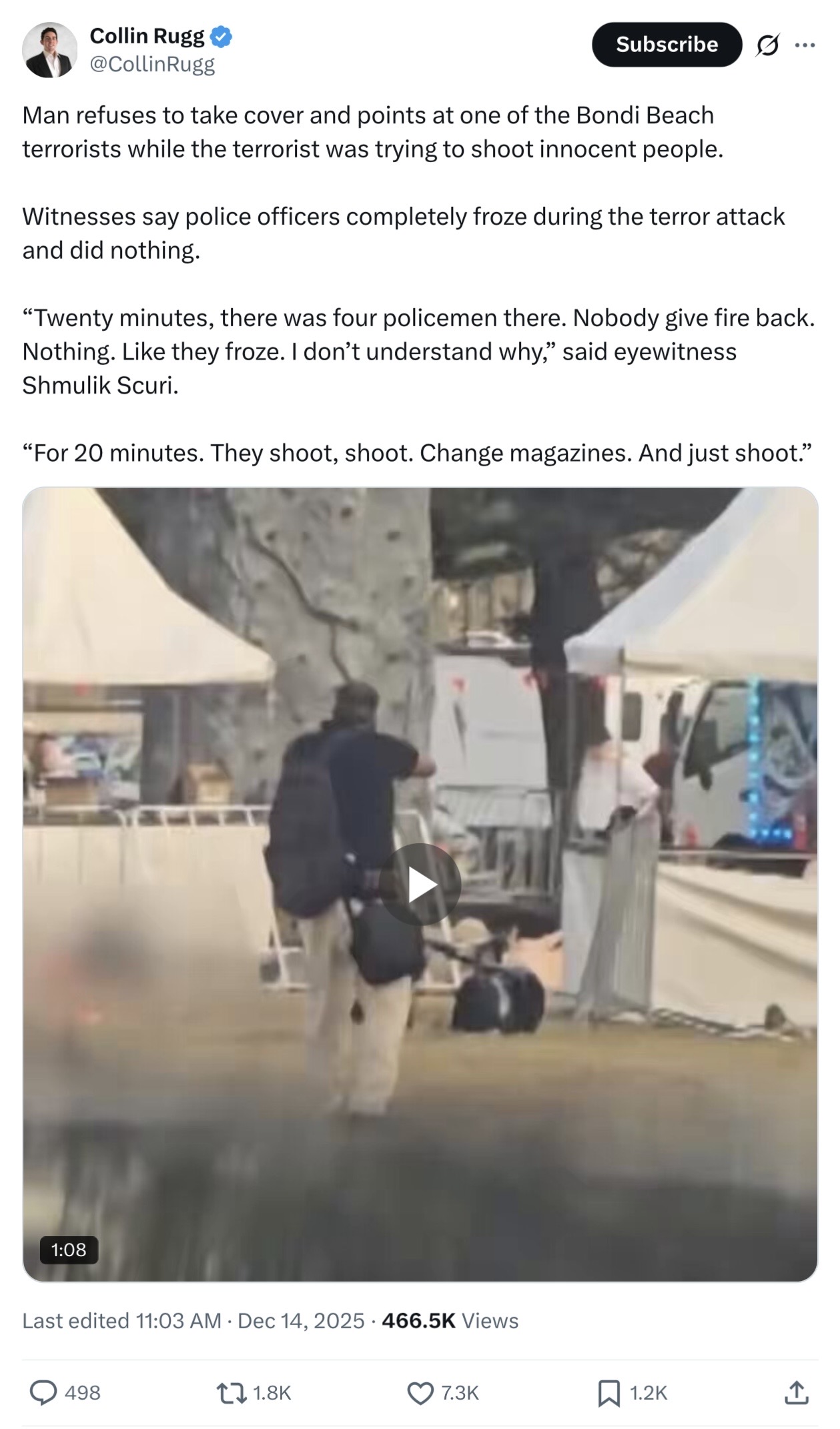 Australia welcomed in the killers who decided to globalize the intifada on Bondi Beach. It welcomed them as “asylum seekers” and “refugees,” but they were actually Islamic jihadis, or became Islamic jihadis once in Australia. (Either way, it’s not a good advertisement for Australia’s immigration policy, which is essentially the same as immigration policies all over Europe and North America.) One of the mass murderers is named Naveed Akram. He is from Pakistan. The other is Khaled al-Nabulsi, who hails from Lebanon and pledged allegiance to the Islamic State (ISIS). Police said that they were “aware” of one of these grateful asylum seekers before he made the decision to murder Jews in large numbers in order to gain the favor of Allah. They did not, obviously, do anything to stop him.